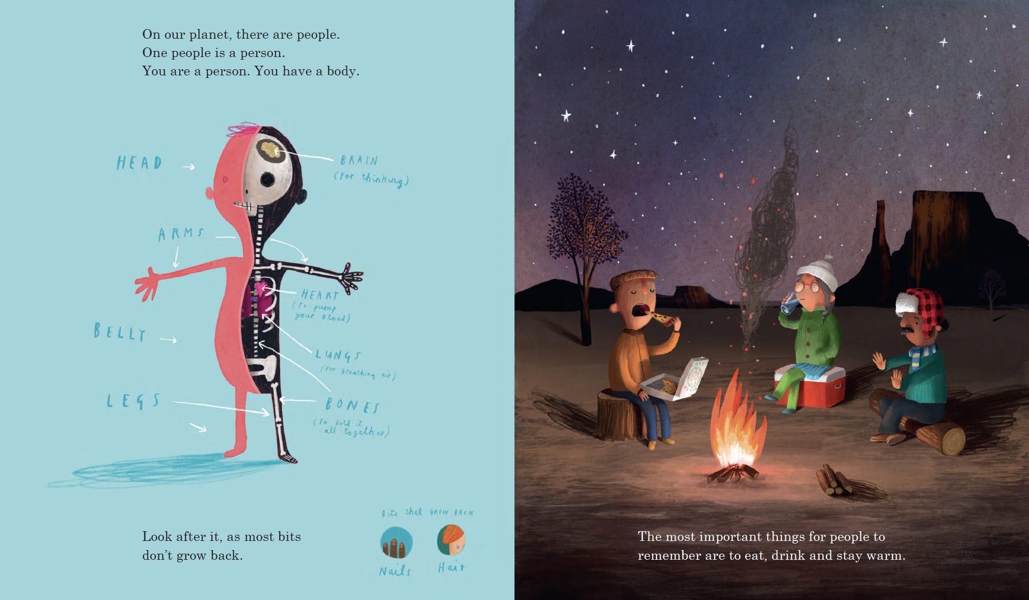 The book offers facts about the land, sea, sky, and the human body. And bits of advice on how to take care of our one, and only, body.